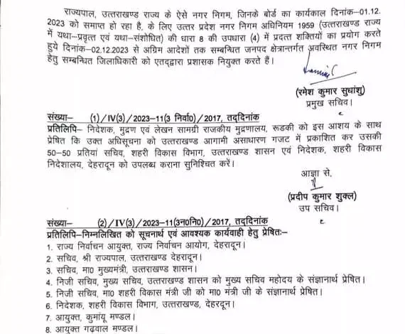 02 दिसंबर से उत्तराखंड के सभी नगर निगम, नगर पालिकाओं और नगर पंचायतों में प्रशासक नियुक्त।
