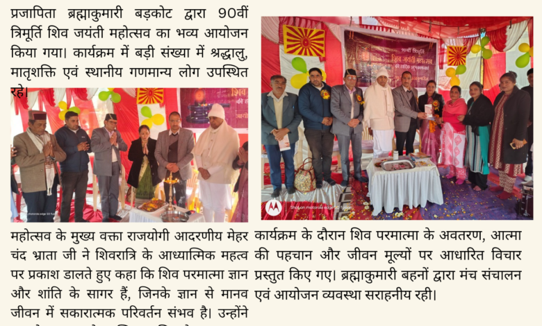 प्रजापिता ब्रह्माकुमारी बड़कोट द्वारा 90वीं त्रिमूर्ति शिव जयंती महोत्सव का भव्य आयोजन किया गया। कार्यक्रम में बड़ी संख्या में श्रद्धालु, मातृशक्ति एवं स्थानीय गणमान्य लोग उपस्थित रहे।